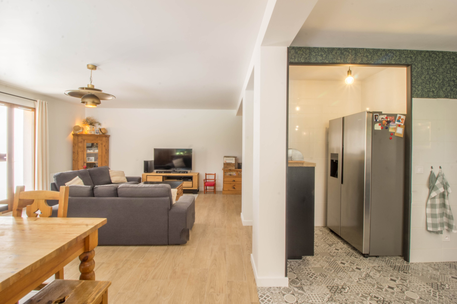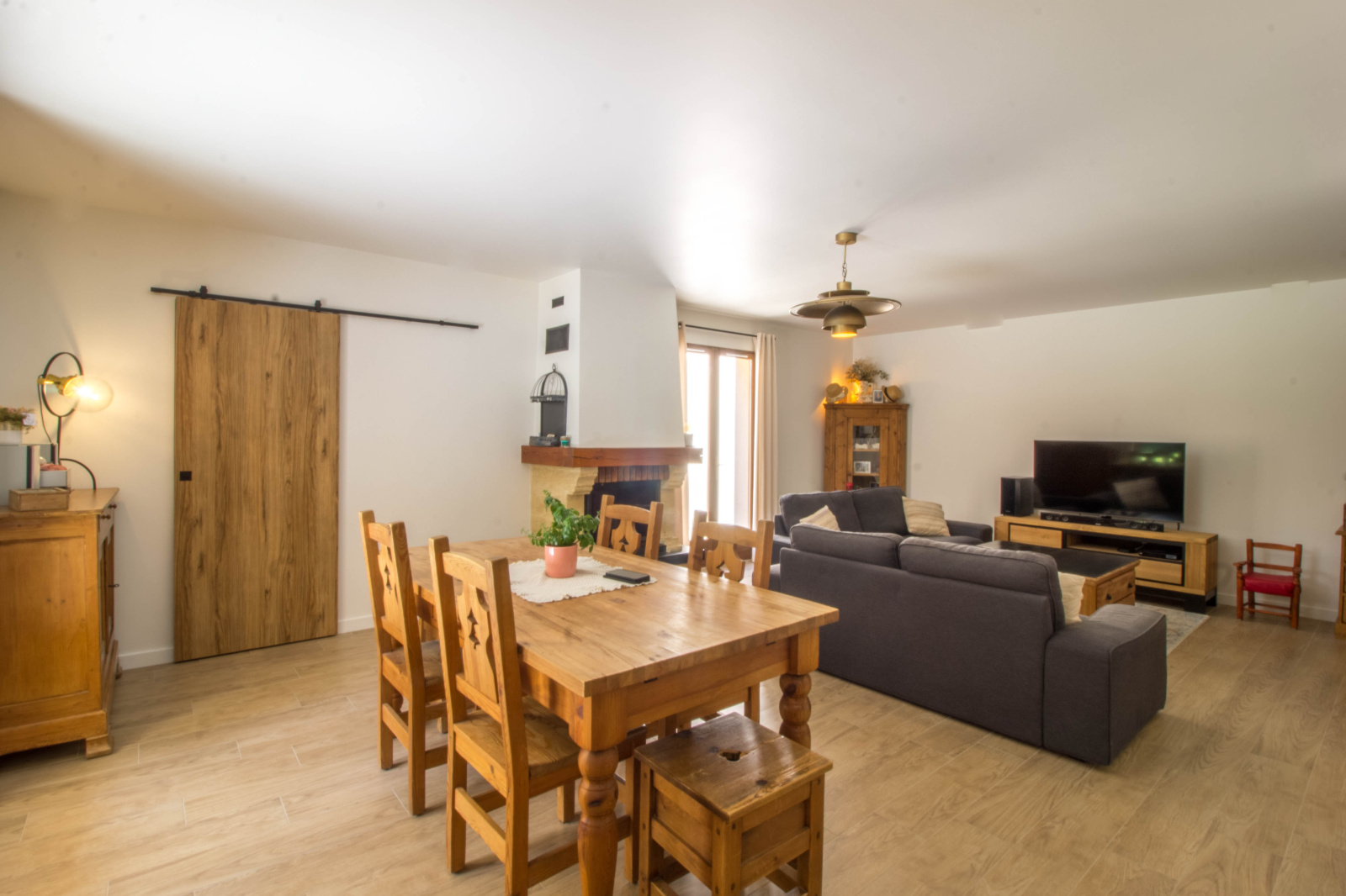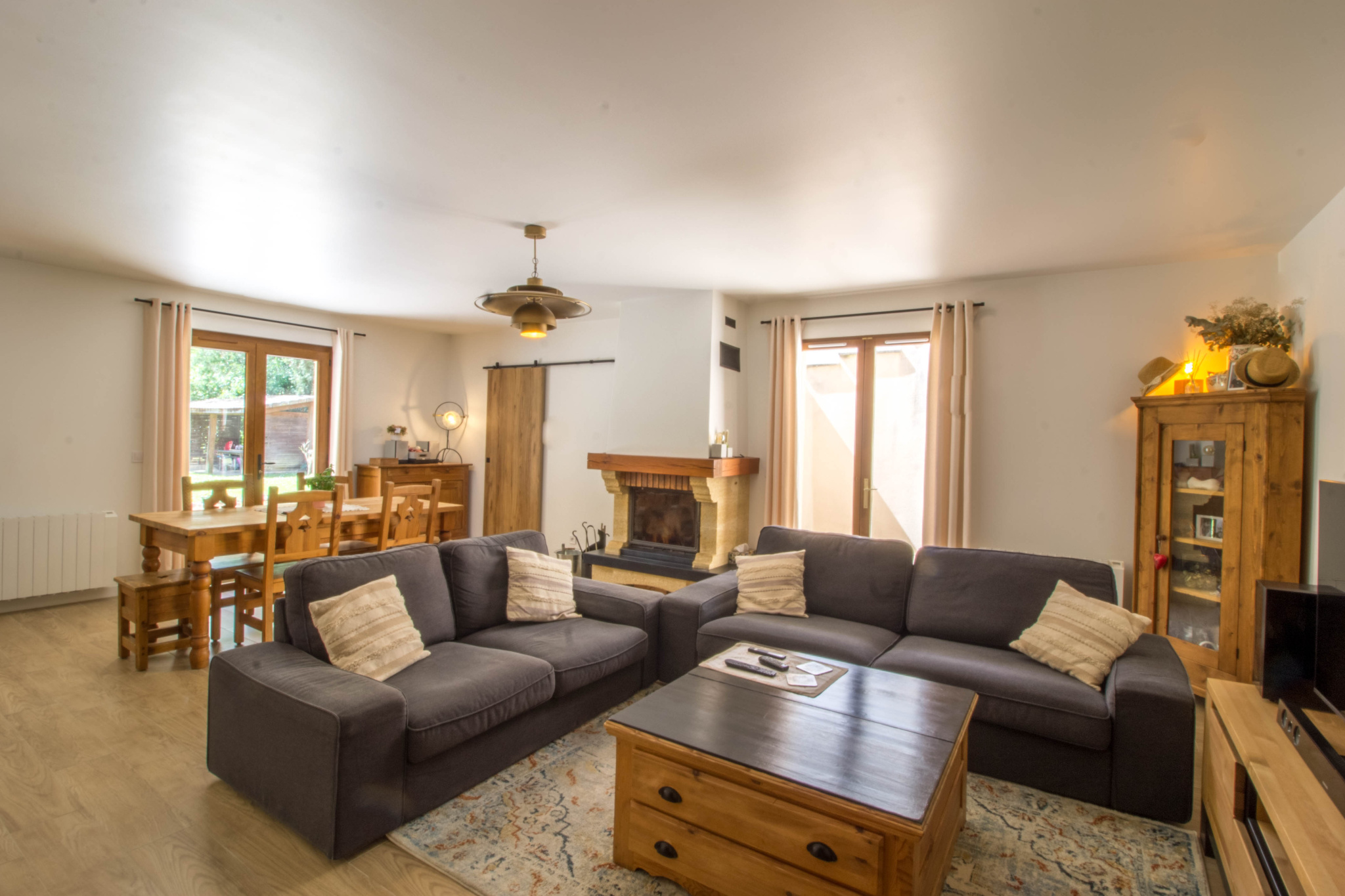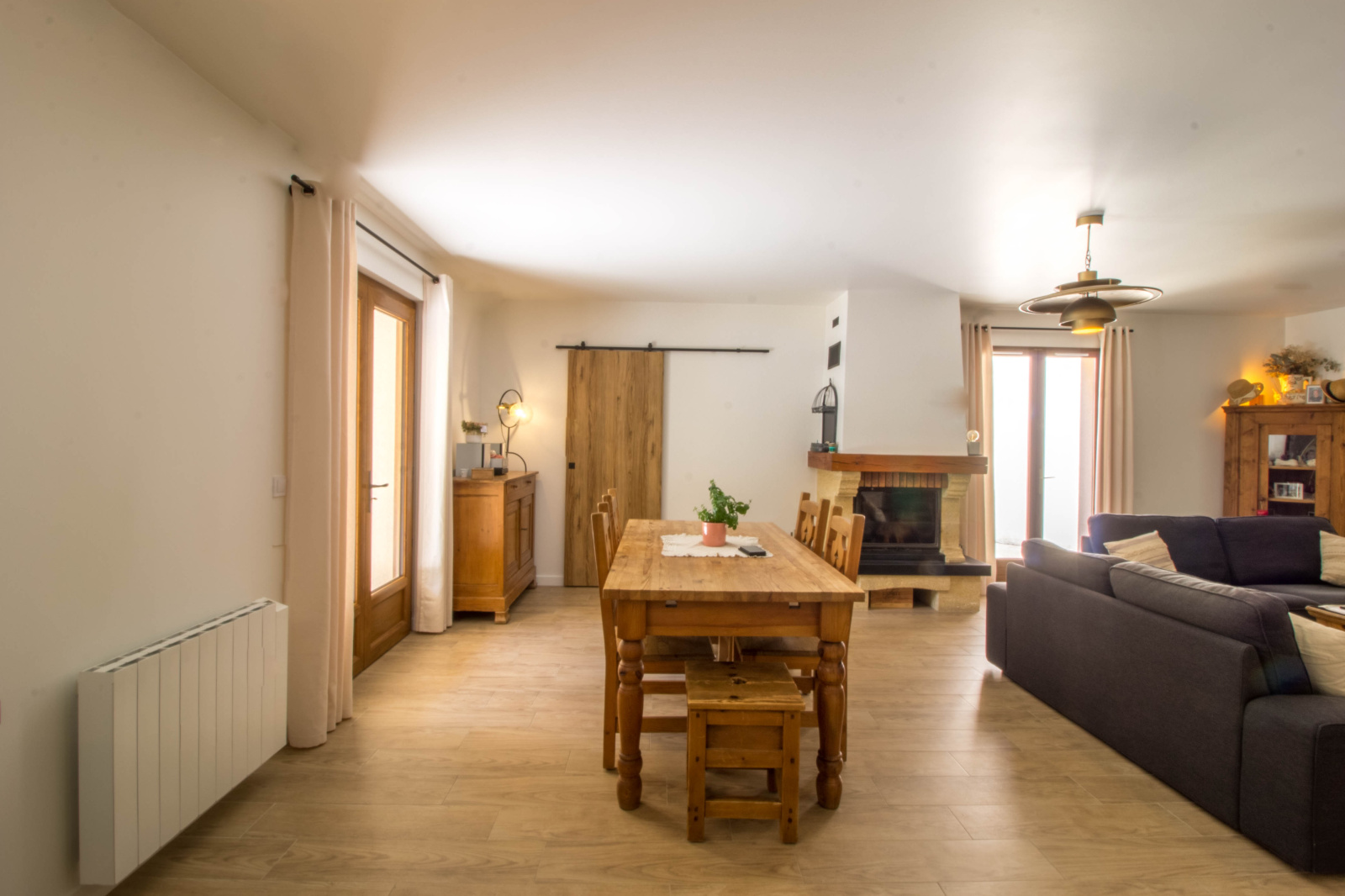 - Une très grande pièce de vie avec un coin salon et un espace repas, accompagnée de sa belle cheminée,