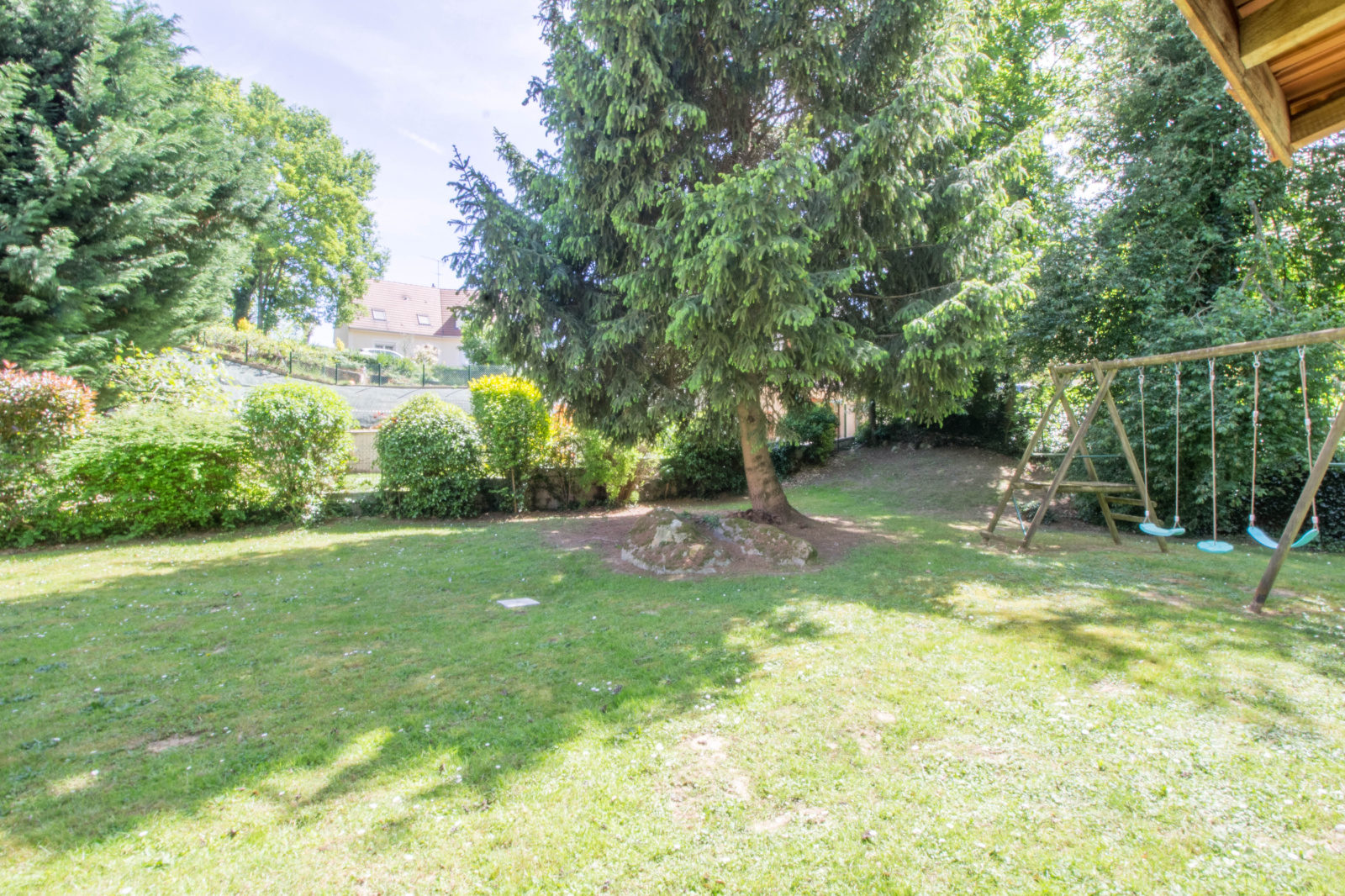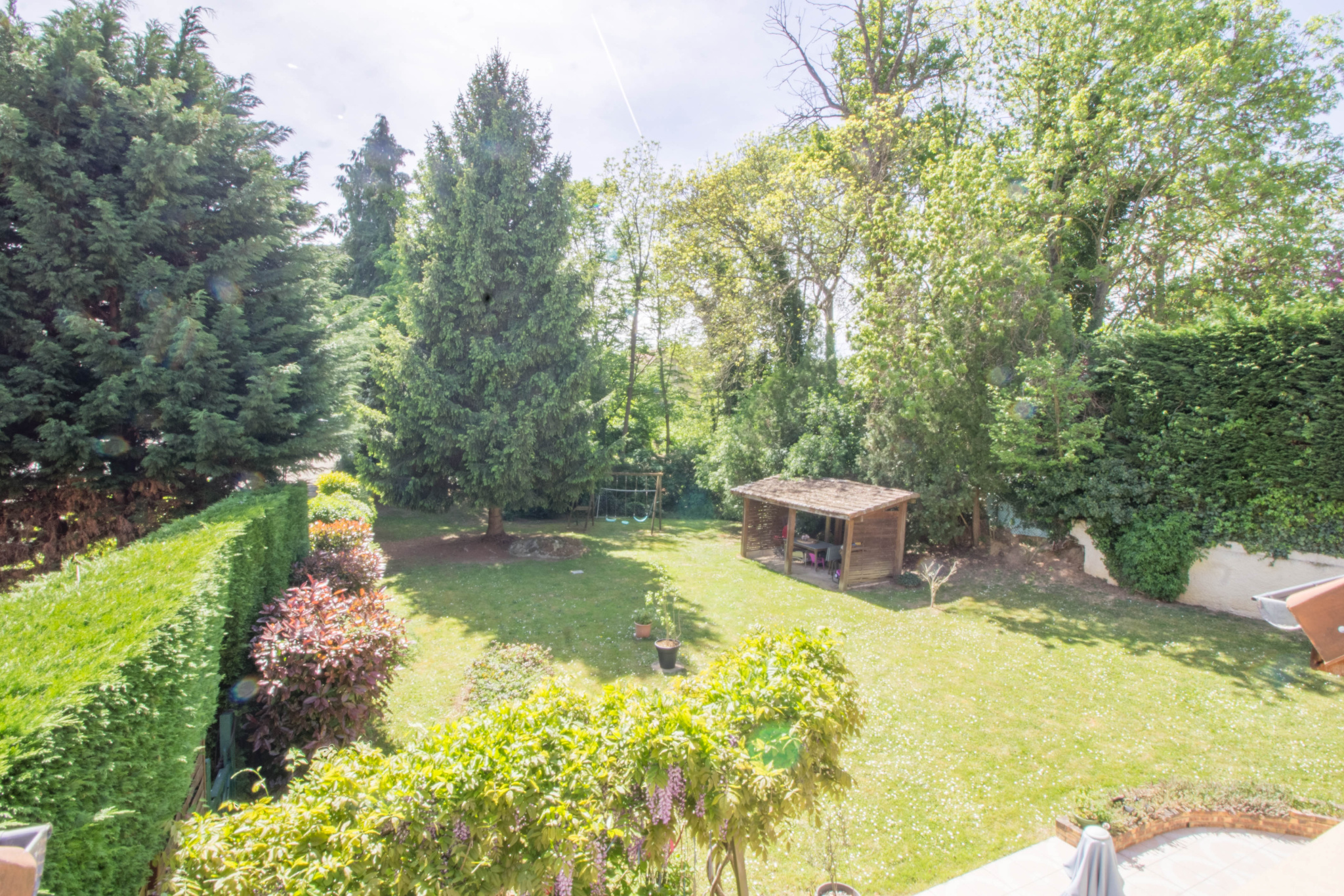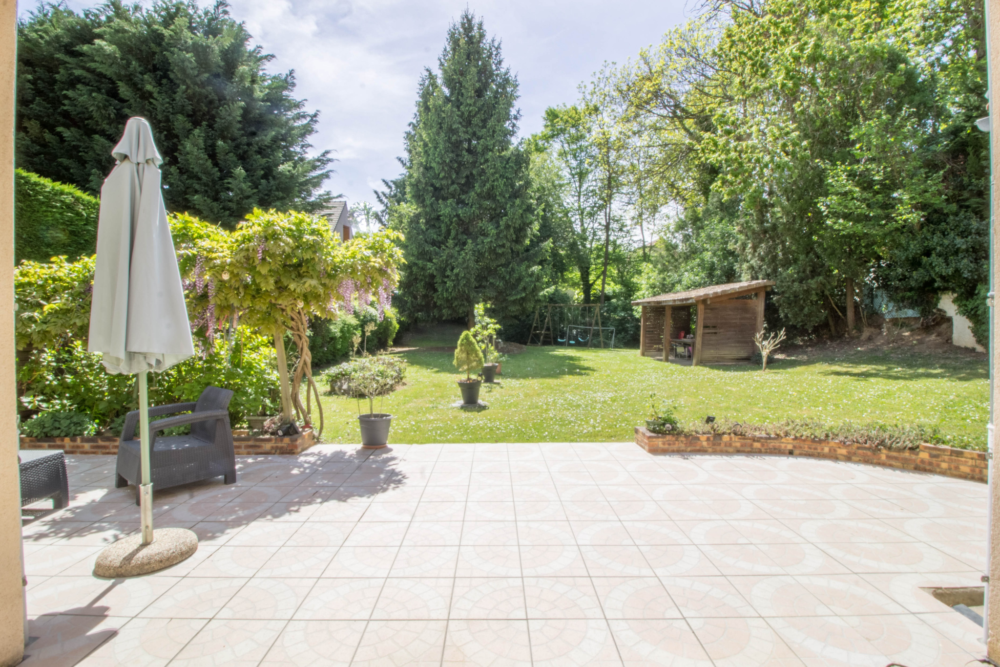 - Un grand jardin sans vis à vis, arboré, et un abris de jardin en bois.