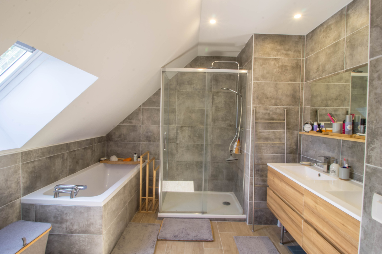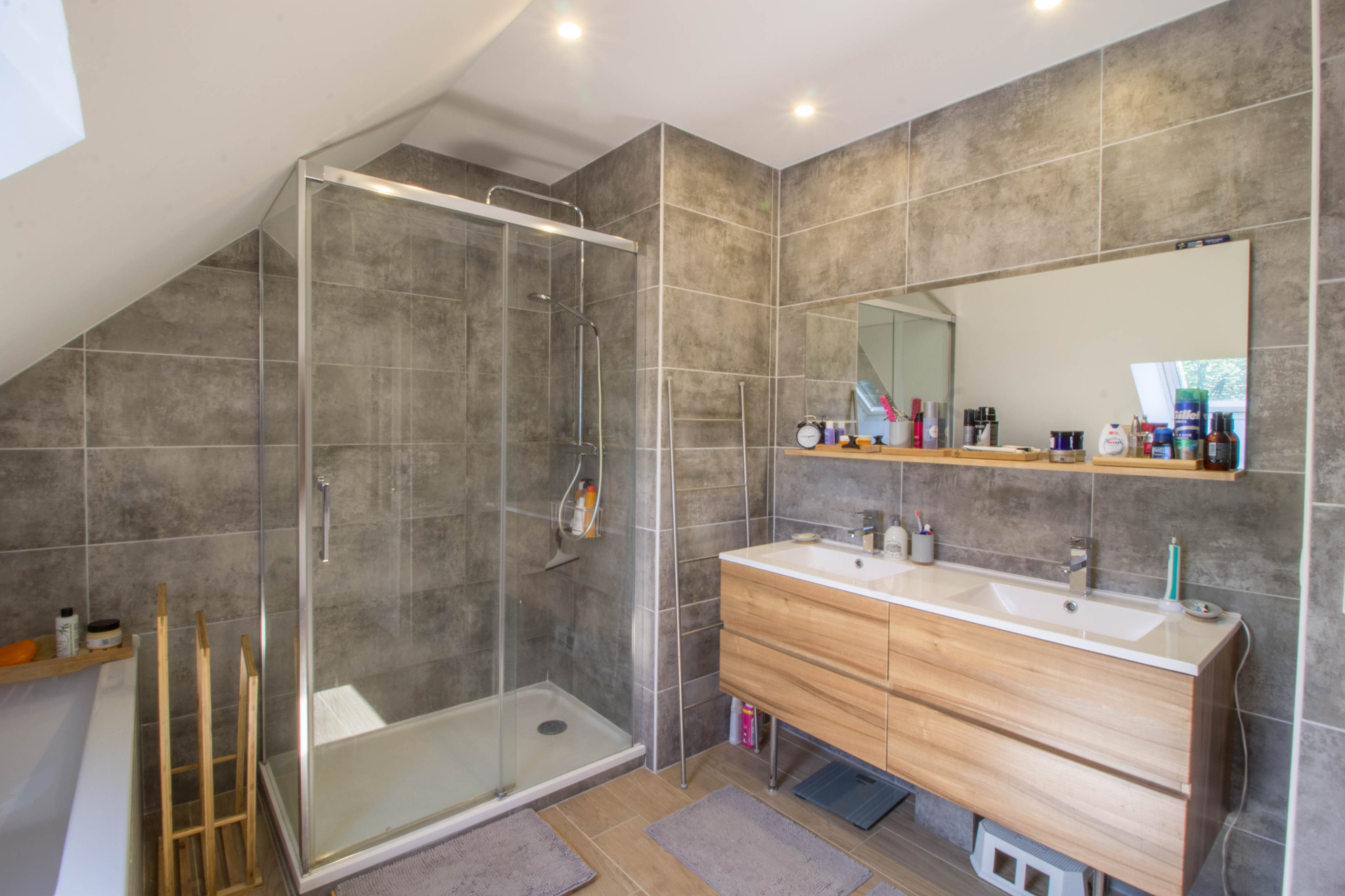 - Une grande salle de douche avec baignoire et double vasques,