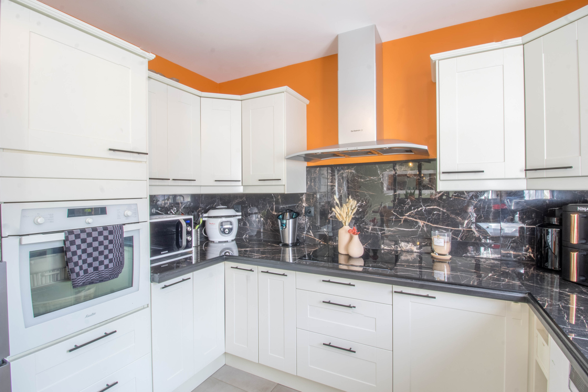- Vous entrerez sur une belle pièce de vie lumineuse, donnant accès au coin salle à manger et à la cuisine ouverte, en L, équipée et aménagée,