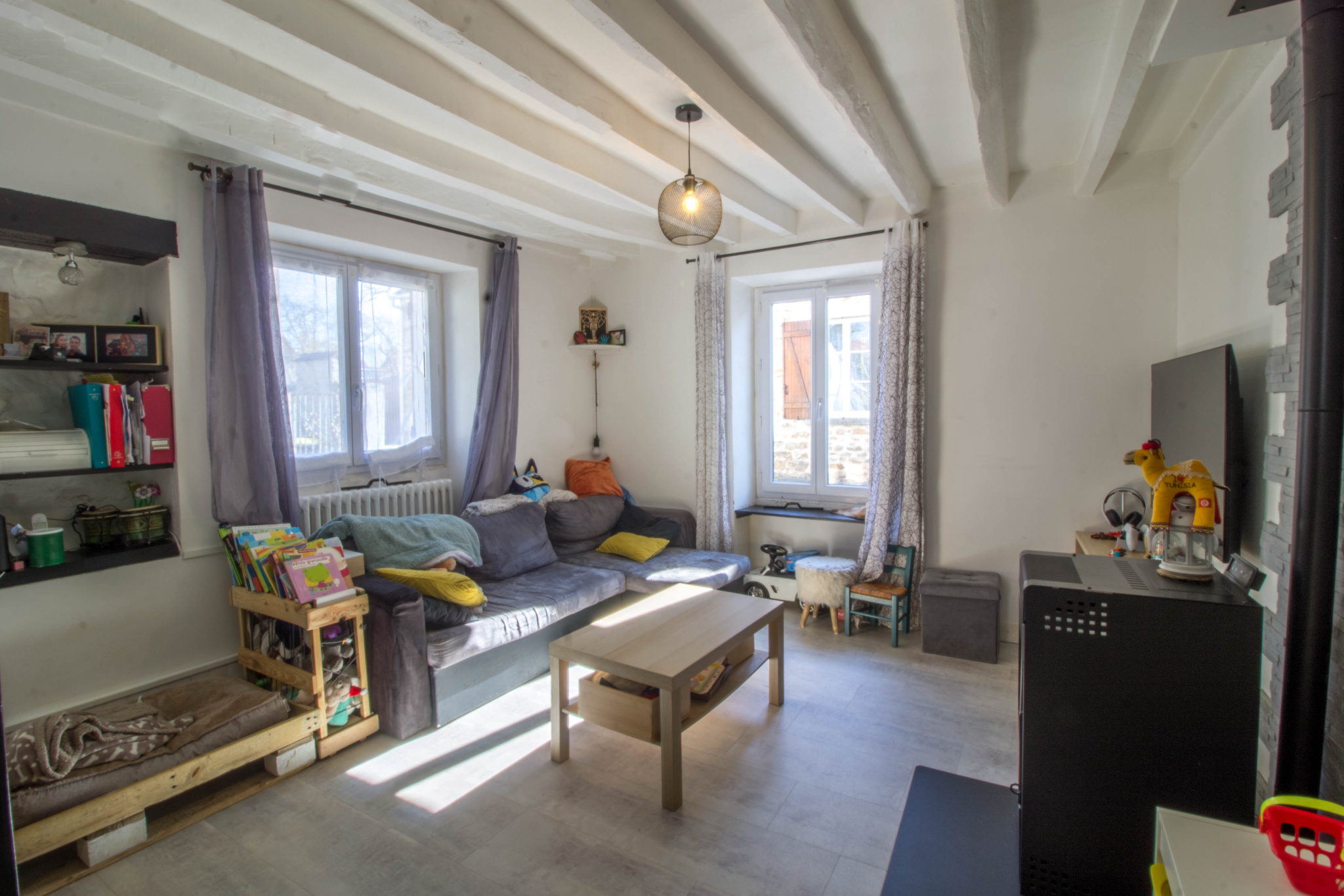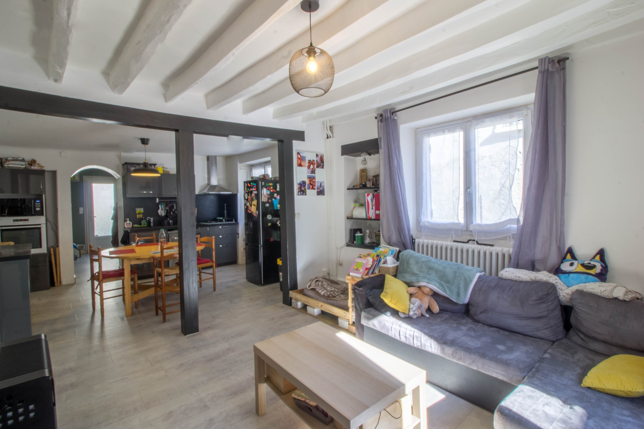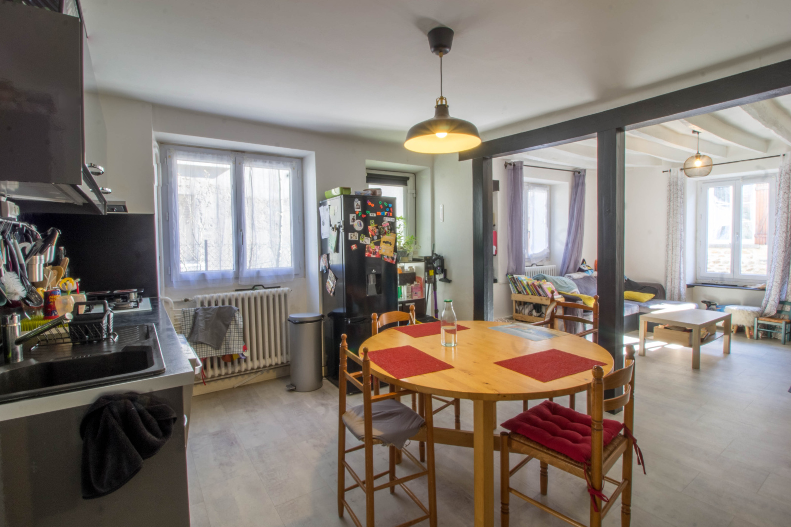 - Une double pièce de vie avec coin cuisine-salle à manger et un coin salon avec son poêle à bois,